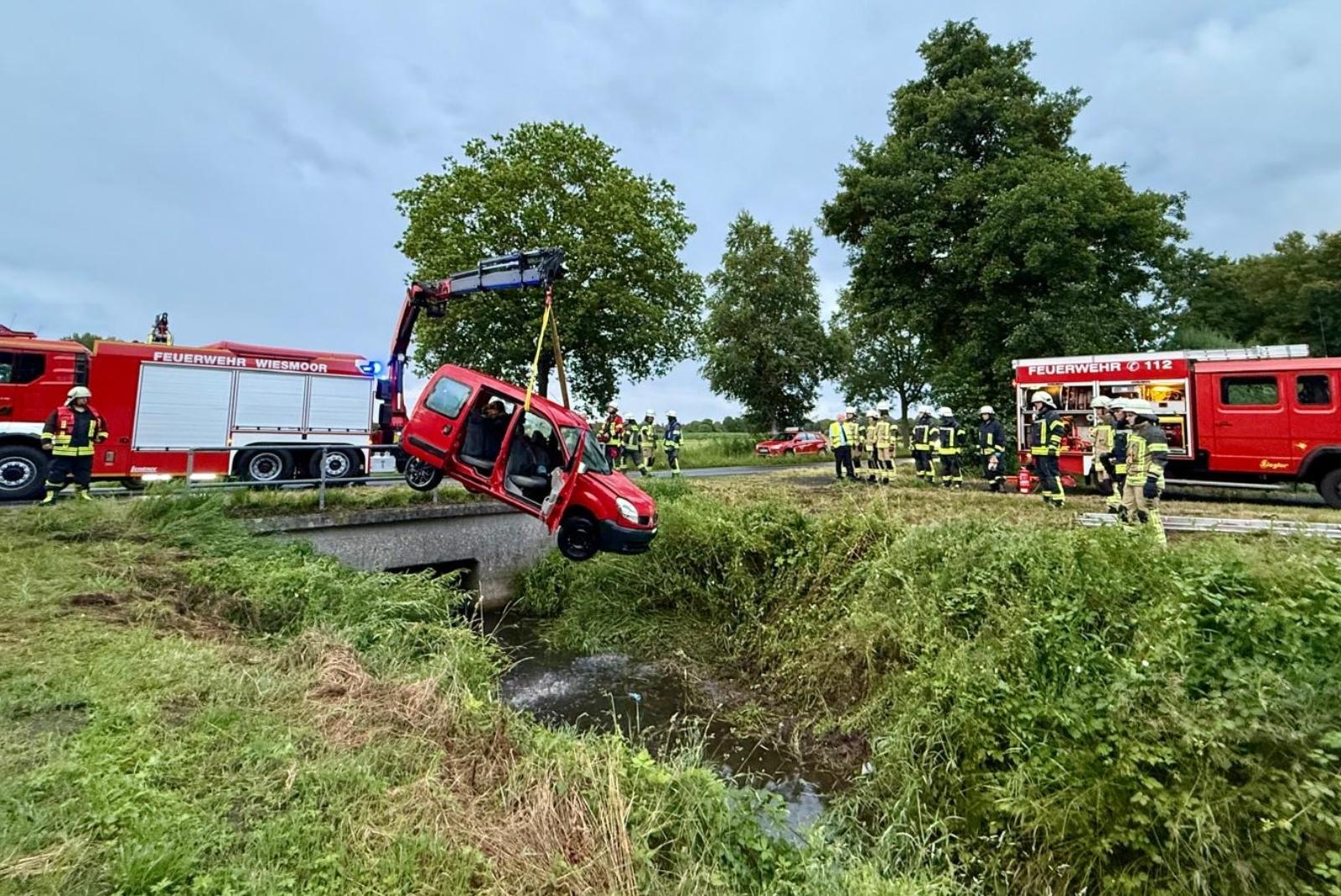 Feuerwehrleute haben einen 21-jährigen Mann aus seinem Auto befreit, nachdem er mit dem Renault am Montagabend in einem Graben in Strackholt gelandet war. Laut der Polizei zog er sich schwere Verletzungen zu.