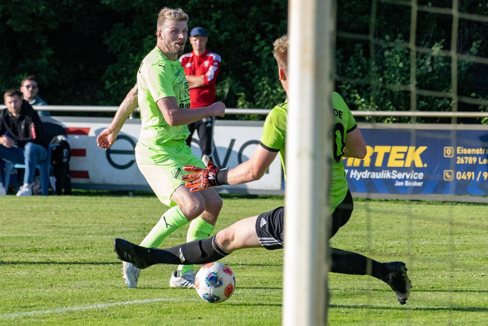 Ein Weeneraner trifft zum 1:0 für Firrel gegen Bunde: Steffen Busemann schiebt hier den Ball unter Bundes Joost Oltrop hindurch ins Netz. © Bruins