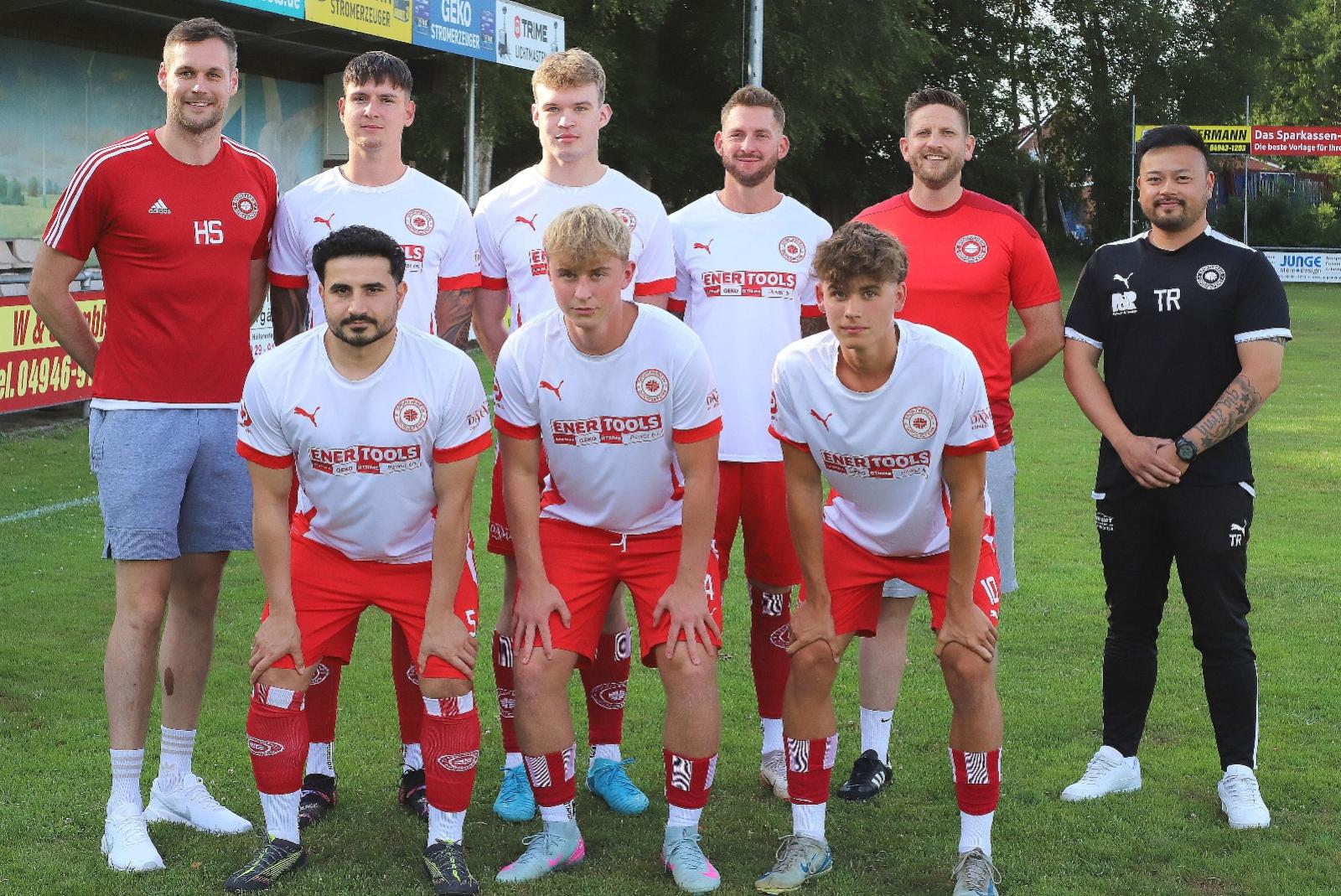 Die Sportlichen Leiter des SV Großefehn, Hauke Specht (links) sowie Andre Frerichs (hintere Reihe, zweiter von rechts), sowie Trainer Bi Le Tran präsentierten sechs Zugänge für die kommende Bezirksliga-Saison. Dazu gehören Leon Zimmermann (hinten von links), Malte Braun, Jürgen Zimmermann sowie Amar Karan (vorne von links), Tino Bohlen und Levin Fahnster. © Gronewold/ON