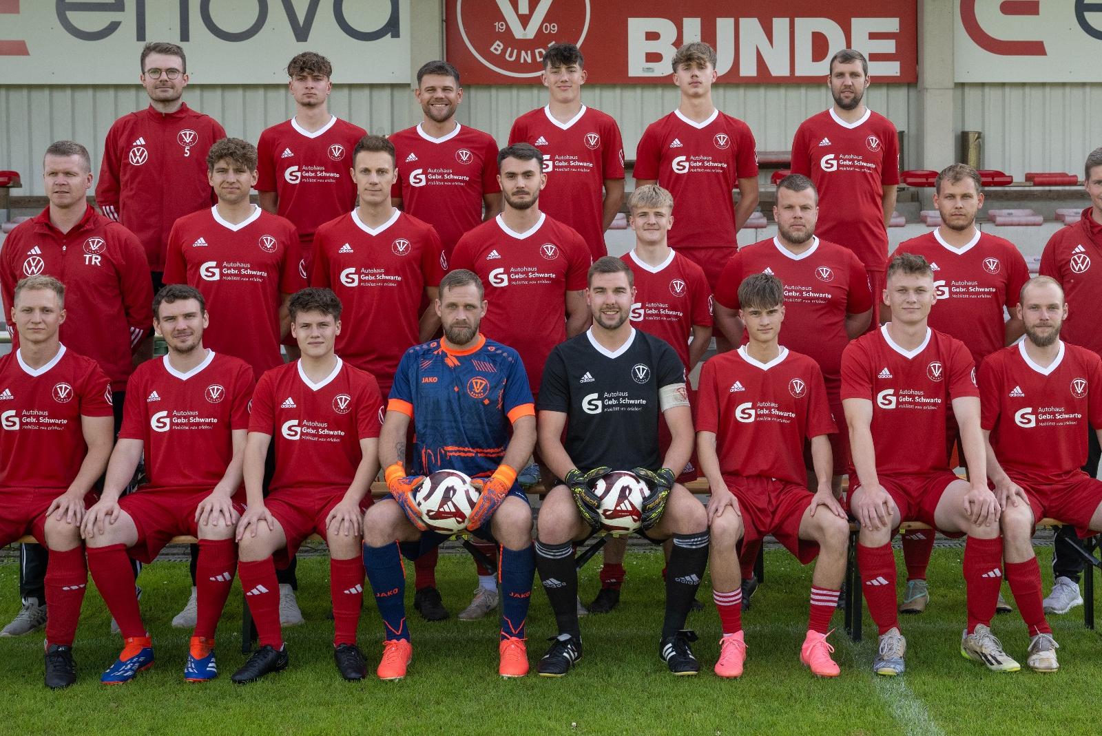 Die 2. Herren des TV Bunde in der Saison 25/26. Obere Reihe von links: Betreuer Elmar Hilbrands, Mattis Klawitter, Anatoli Elzen, Niklas Lübbers, Joost Battermann und Sven Hertema. Mittlere Reihe von links: Trainer Christian Meyer, Jannik Boekhoff, Maik Tirrel, Tim Sanders, Melwin Pletsch, Marco Borchers und Tammo Neumann. Untere Reihe von links: Marcel de Vries, Artur Bertram, Marvin Pletsch, Marcel Kayser, Jannes Muising, Thies Groenewold, Bendix Tönjes und Jelto Neumann. Es fehlen: Niklas Diekmann, Volker Wirtjes, Thomas Girod, Sönke Meinders und Enno Oorlog. © Bruins