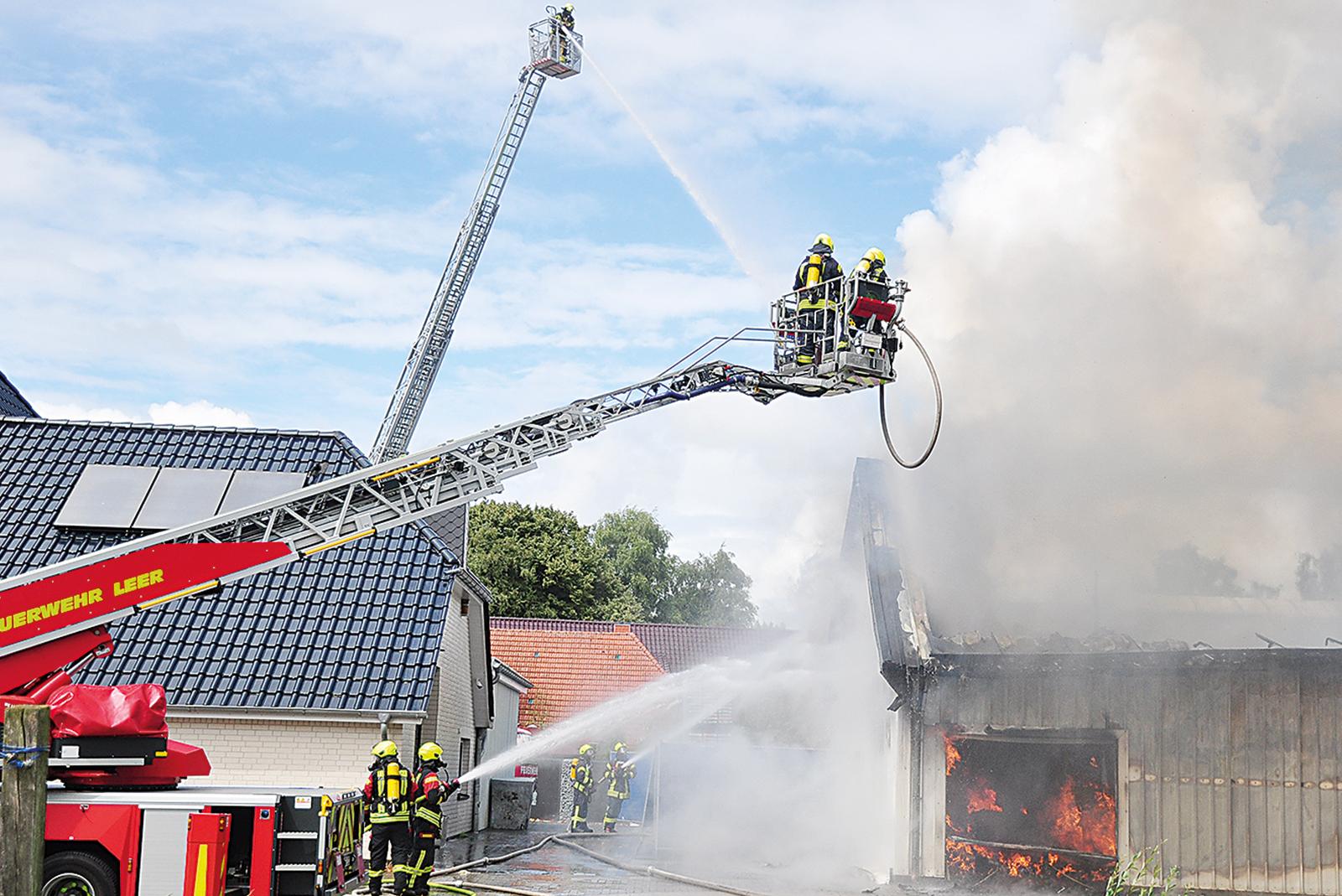 Im Einsatz bei der Bekämpfung des Feuers waren auch die beiden Drehleitern der Feuerwehren aus Leer und Emden ...
