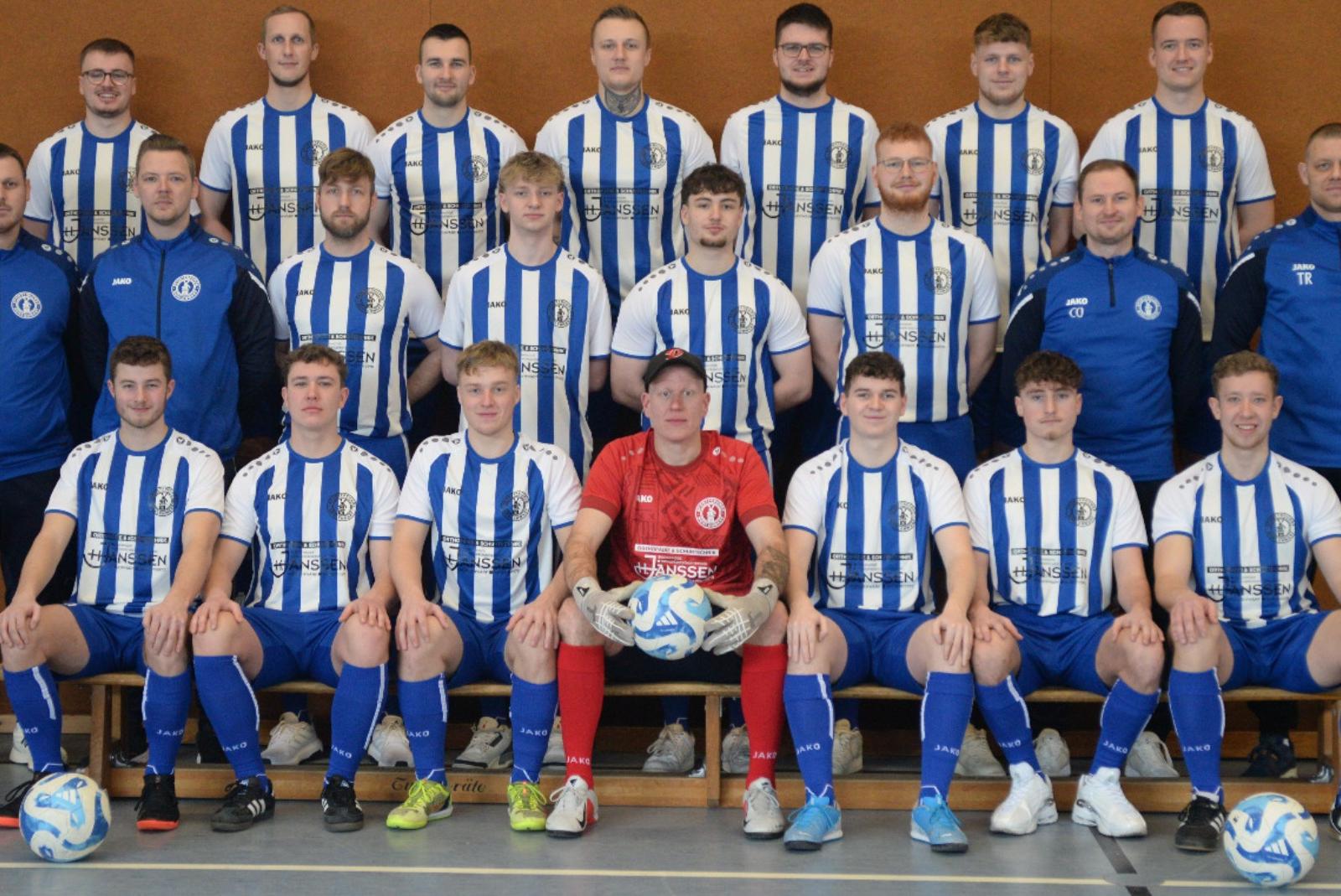 Die 1. Herren des Sportfreunde Möhlenwarf in der Saison 25/26. Obere Reihe von links: Jonas Krüger, Gerd Siemens, Matthias Steenhardt, Wolfgang Saathoff, Domenik Bosma, Kevin Klüver und Marc Heijenga. Mittlere Reihe von links: Betreuer Jens Kappernagel, Co-Trainer Sebastian Schmieder, Jens Hagen, Joris Theile, Luca Hartog, Thorben Haken, Co-Trainer Thomas Cassens und Trainer Pascal Walker. Untere Reihe von links: Luka Holtkamp, Keno Sonnenberg, Pascal Frey, Jens Diddens, Marcel Jäschke, Bahne Hilbrands und Lucas Sonnenberg. Es fehlen: Joost Diepen, Marcel Frey, Andre Voss, Eric Schoormann und Mattis Schmidt. © Born