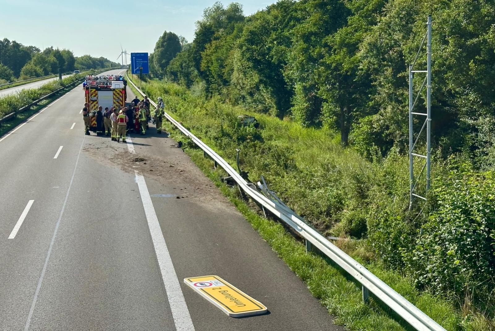 Auf der Autobahn 28 bei Filsum hat es heute einen verhängnisvollen Unfall gegeben. Ein Skoda Karoq, der in Fahrtrichtung Leer unterwegs war, kam laut Feuerwehr von der Straße ab und geriet auf eine Leitplanke. Wie auf einer Sprungschanze schoss der Wagen in die Höhe, traf ein großes Verkehrsschild und überschlug sich mehrfach. Alle vier Insassen, darunter zwei Kinder, kamen verletzt ins Krankenhaus. Das Auto landete in einer Böschung. Der 34-jährige Fahrer und ein zweijähriges Kind, das im Wagen saß, wurden laut Polizei schwer verletzt. Die 34-jährige Beifahrerin und ein ebenfalls zweijähriges Kind erlitten leichte Verletzungen.