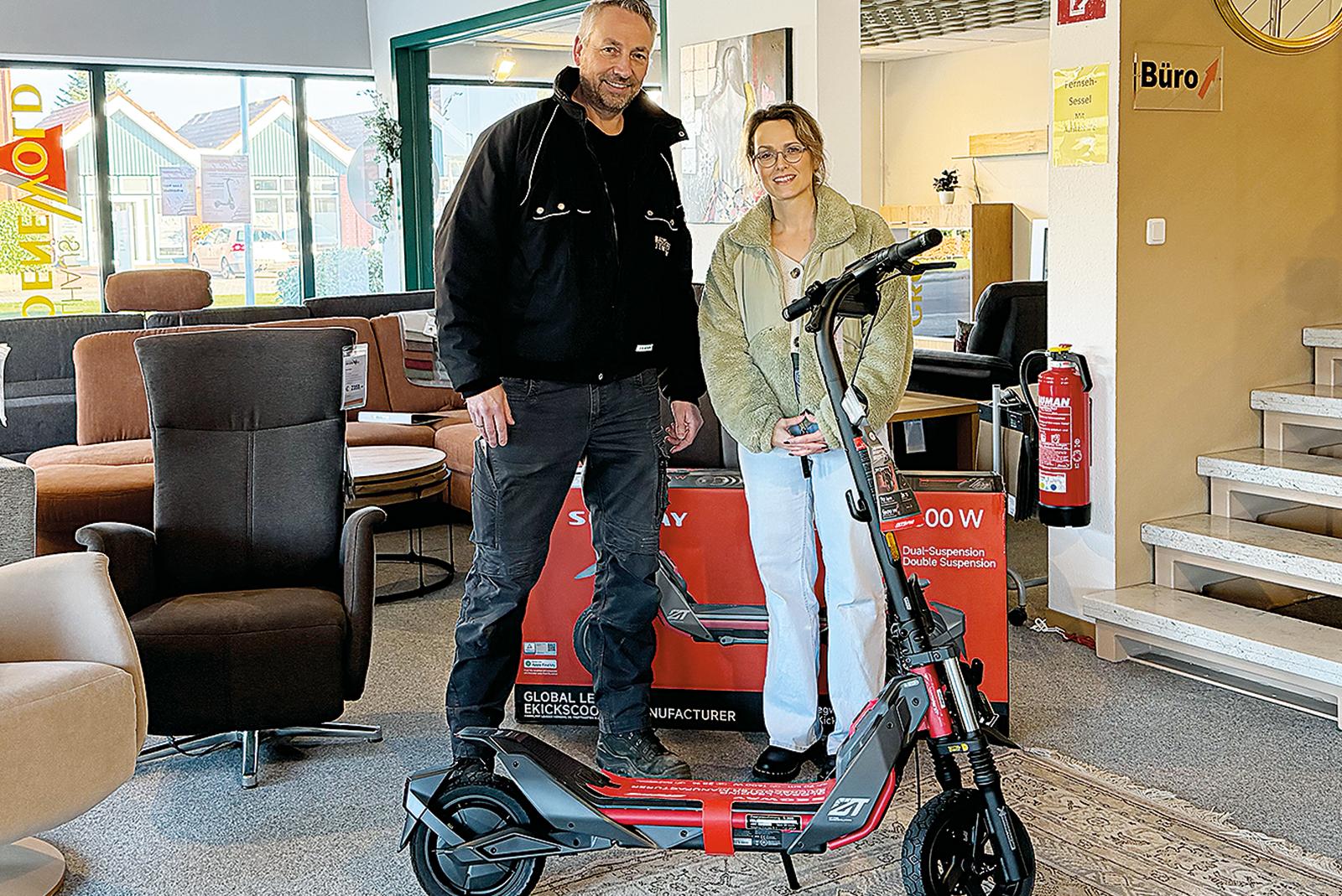 Im Rahmen der Weihnachtsverlosung des Gewerbevereins Jemgum hat jetzt auch der dritte E-Scooter eine glückliche Gewinnerin gefunden: Der Gewerbevereinsvorsitzende Marco Knevel gratulierte Heike Wirth und wünschte ihr anlässlich der Preisübergabe allzeit gute Fahrt. Der vierte und ...