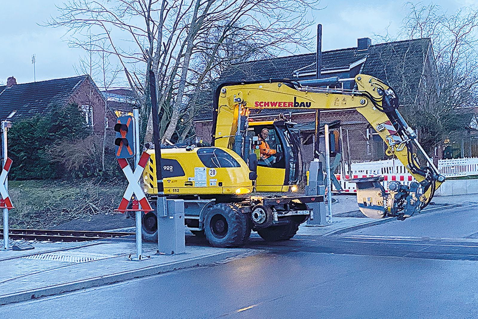 Ein Zweiwegefahrzeug an der Baustelle der Wunderline-Trasse am Bahnübergang Graf-Edzard-Straße Weener. Das Gefährt kann sowohl auf der Straße als auch auf Schienen fahren. © Foto: Hanken