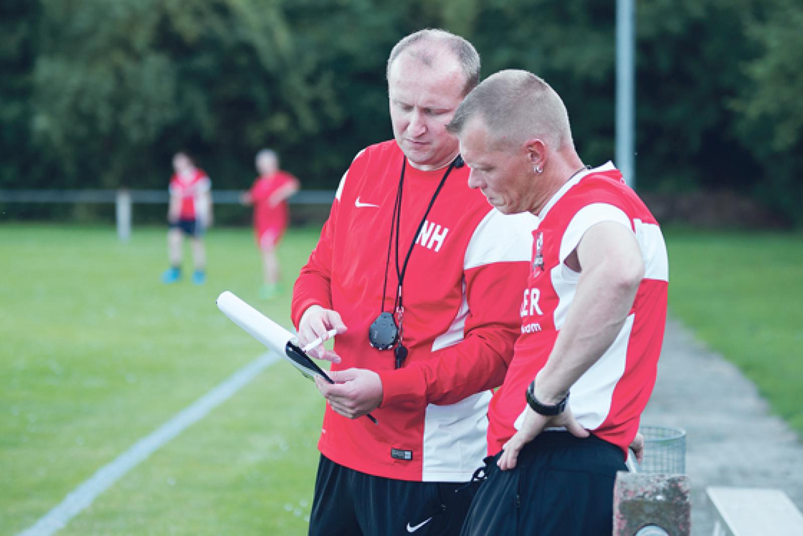 Können bereits die Taktik für die zweite Pokalrunde austüfteln: Die Jemgumer Trainer Nils Hofmann (links) und Tim Schulte. © Foto: Mentrup