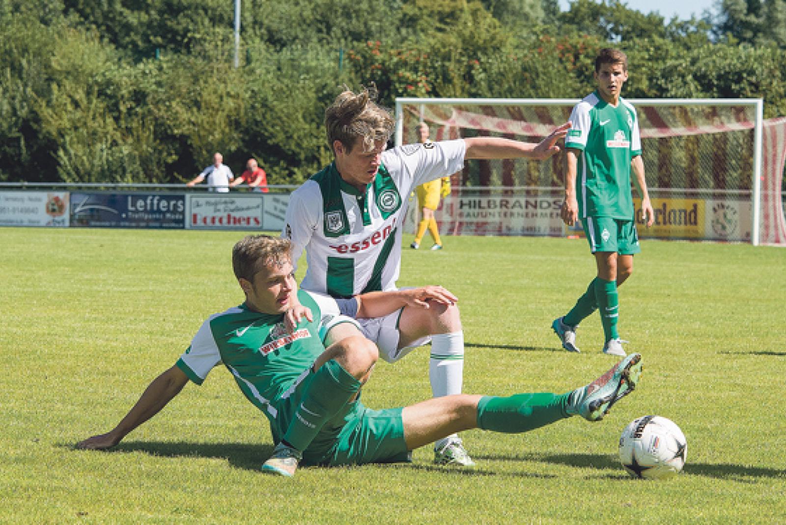 Bodenkampf: Die Talente vom SV Werder Bremen und vom FC Groningen lieferten sich in Bunde ein spannendes Duell. © Foto: Mentrup