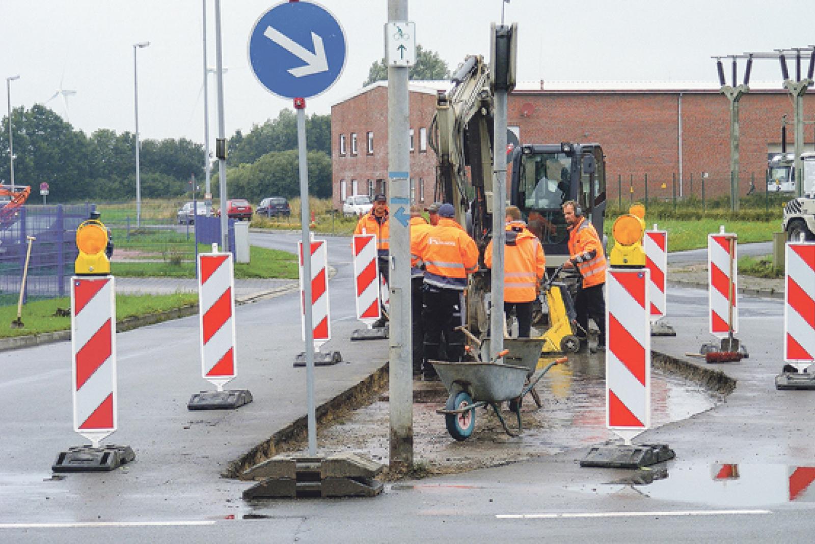 Die Verkehrsinsel im Einmündungsbereich der Industriestraße in Weener wird seit Dienstag zurückgebaut. Die Arbeiten durch die Firma Huneke stehen in Zusammenhang mit dem Bau einer neuen Windkraftanlage auf dem Heizkraftwerk-Gelände der »Weener Energie GmbH«.