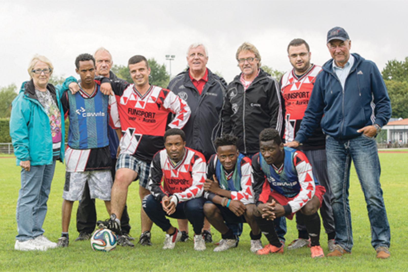 Vereint auf dem Platz: (oben v. l.) Integrationslotsin Christine Leisten, Nuru Erzik, Arnold Kappernagel, Unitet Sinani, Gerold van Hoorn, Andreas de Vries, Hashem Moshala, Dieter Gelder, (unten v. l.) Bruno Mijeanbi, Mohammed Kone und Sekou Dagnogo. © Fotos: Mentrup