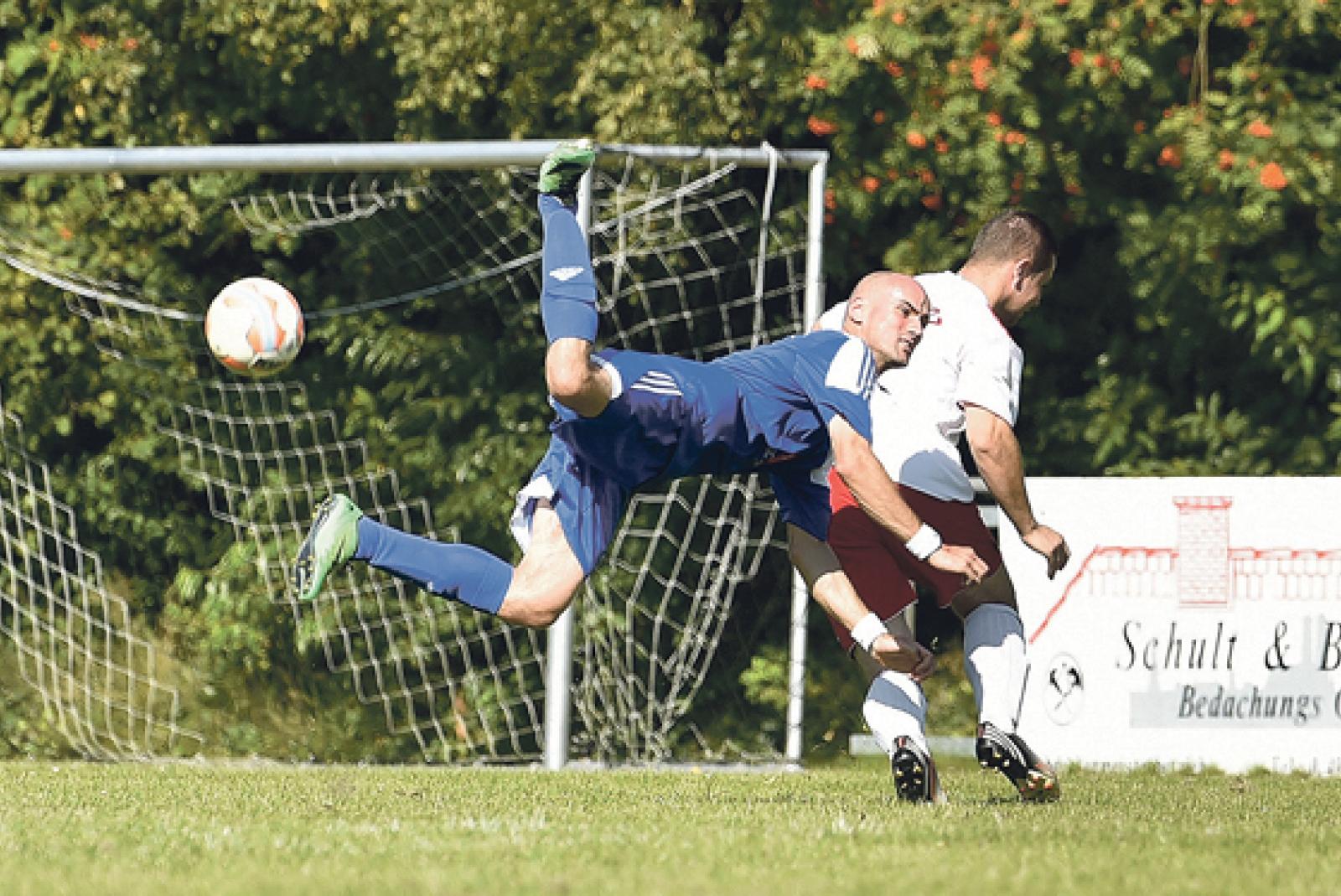 Da fliegt er: Holthusens Jan Berends beim artistischen Versuch zu klären. © Foto: Bruins