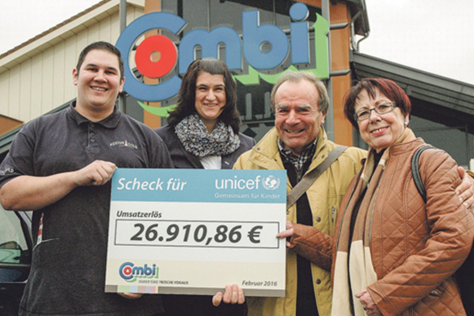 Der ehrenamtliche Verkauf weihnachtlicher Grußkarten des Kinderhilfswerks der Vereinten Nationen (Unicef) in den »Combi«-Verbrauchermärkten der Unternehmensgruppe Bünting hat diesmal einen Umsatzerlös von 26.910,86 Euro erbracht. Im »Combi«-Markt in Bunde wurde gestern der symbolische Scheck übergeben.