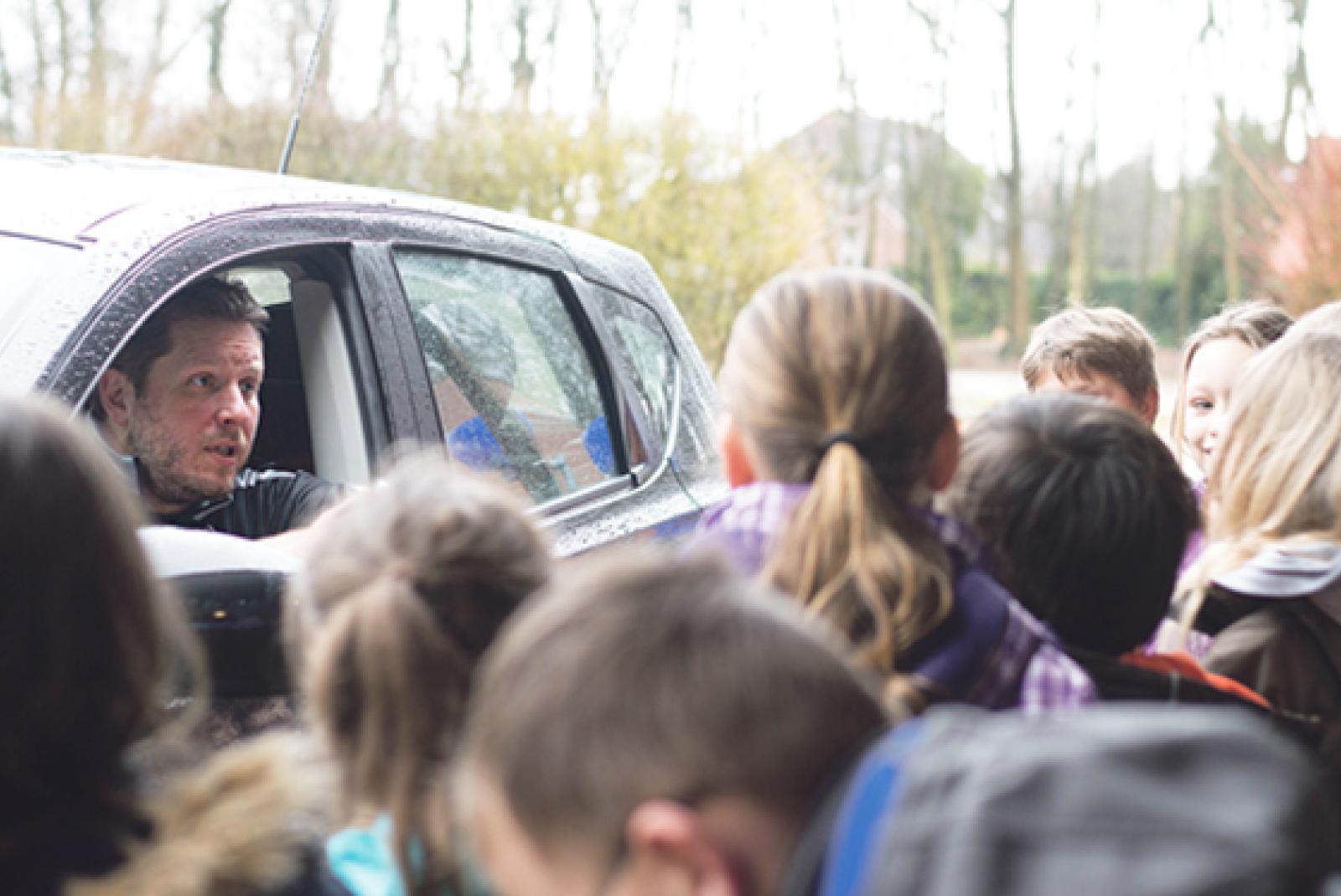 Jens Fricke demonstriert den Kindern eine Entführung und zeigt ihnen einfache Techniken, wie sie sich davor schützen, wenn sie jemand in ein Auto zerren will. Auch auf dem Fahrrad wurde demonstriert, wie man sich am besten verhält, wenn ein Fremder sie anspricht. © Fotos: Abbas