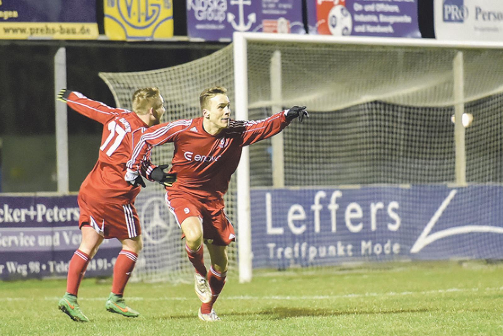 Der Auftakt einer furiosen ersten Bunder Hälfte: Keno Schmidt bejubelt sein Tor zum 0:1, Alexander Vogel feiert mit. ©