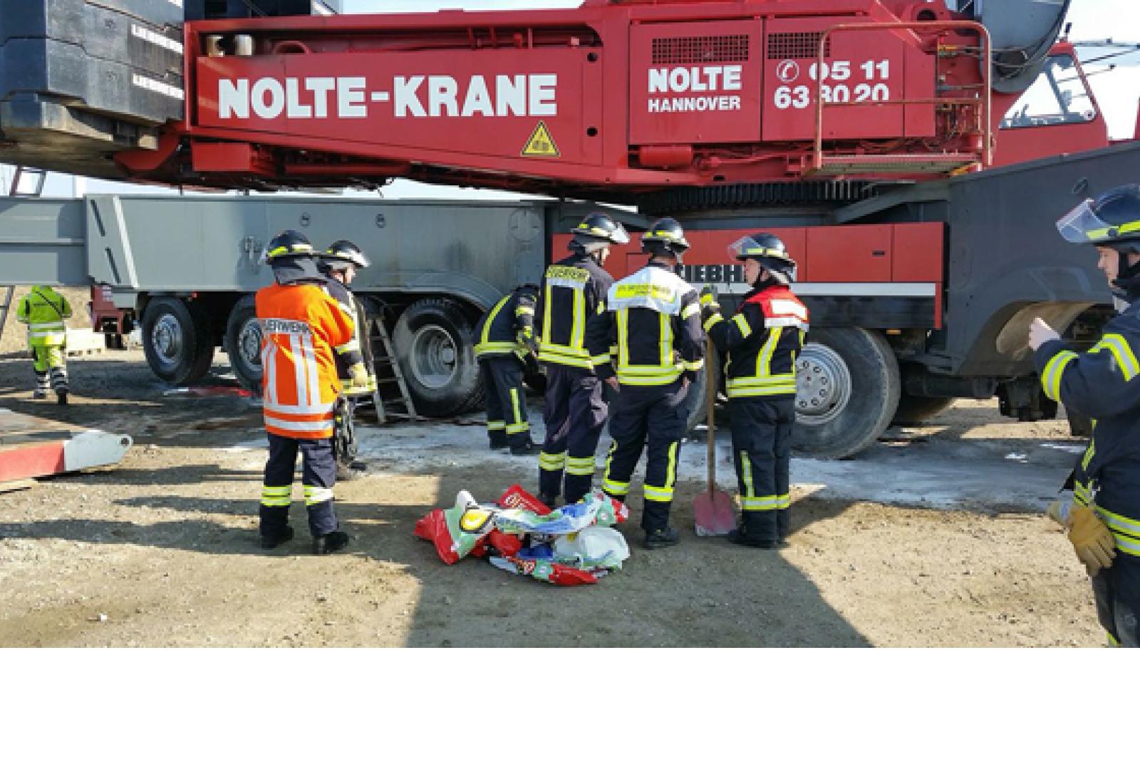 Kurze Zeit nach der Alarmierung waren die ersten Einsatzkräfte der Feuerwehr Bunde an der Baustelle am Heerenweg. Der betroffene Kran, ein über 100 Meter hoher Autokran, hatte die Nabe einer Windenergieanlage mit drei Rotorblättern am Haken. Rund 150 Liter Öl waren ausgelaufen. Mit Bindemittel gingen die Einsatzkräfte gegen den Umweltschaden vor. Aufgrund der ausgetretenen Menge Öl musste die Kreisfeuerwehr weitere Säcke Bindemittel zur Einsatzstelle bringen. Die untere Wasserbehörde des Landkreises Leer wurde ebenfalls zur Einsatzstelle gerufen.